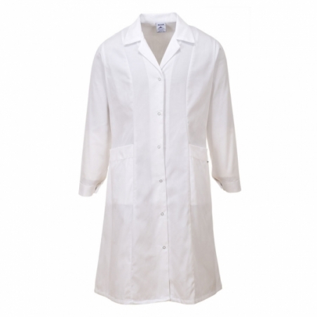 • Znakomicie dopasowany klasyczny damski fartuch roboczy z dwoma kieszeniami u dołu. Zapinany na napy. Mankiety regulowane napami.