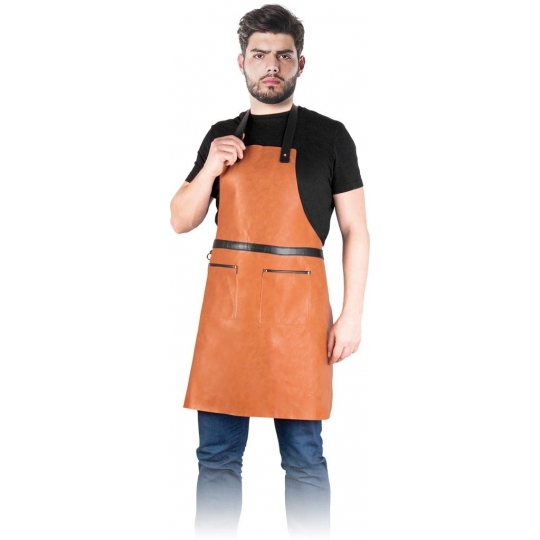 Fartuch ochronny przedni. - wykonany z tworzywa imitującego skórę - wymiar: 80x70 cm - wiązany w pasie z dodatkową klamrą umożliwiającą regulację - regulowany pasek na szyję - dwie przednie kieszenie