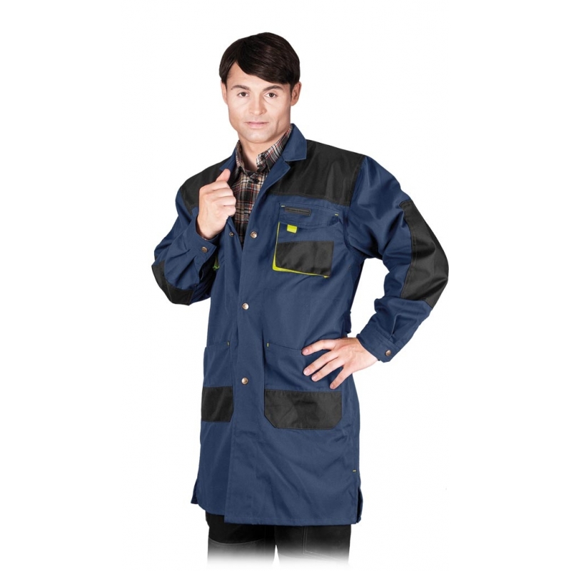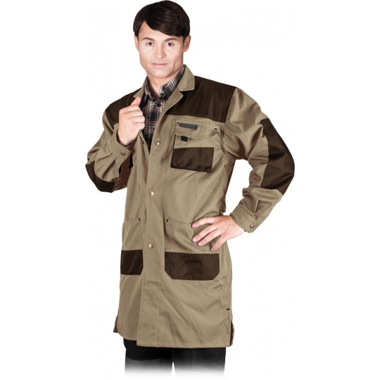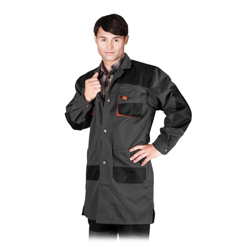 Fartuch ochronny FORMEN. - 65% poliester, 35% bawełna - gramatura 270 g/m2 - zapinany na napy - w partii pasa z tyłu fartucha pasek z tego samego materiału - dwie kieszenie na klatce piersiowej na rzepy, w tym jedna na telefon oraz dwie wąskie kieszonki na przybory np. długopis - rękawy zapinane na napy - na ramionach, kieszeniach oraz łokciach dodatkowe wzmocnienie co zwiększa wytrzymałość fartucha na przetarcia - staranne wykonanie oraz zwiększona wytrzymałość zapewniają wysoki komfort użytkowania - certyfikat OEKO-TEX® Standard 100 (testy na zawartość szkodliwych dla zdrowia substancji)