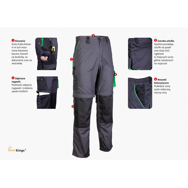 POLSTAR SEVEN KINGS – SPODNIE DO PASA ONYX (ODPINANE NOGAWKI)Spodnie Seven Kings Onyx wykonane są z wysokiej jakości materiału o gramaturze 260 g/m², odpornego na utratę kolorów i rozmiaru po praniu. Podwójne szwy, mocna nić oraz liczne ryglówki gwarantują trwałość. Model posiada odpinane nogawki, wzmocnione kieszenie oraz ergonomiczną kieszeń na nakolanniki. Wstawki kolorystyczne i kontrastowa lamówka nadają im nowoczesny wygląd.