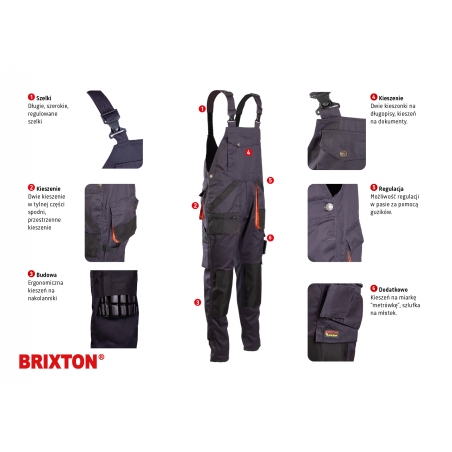 POLSTAR BRIXTON PRACTICAL – SPODNIE OGRODNICZKIOgrodniczki Brixton Practical wykonane są z trwałej tkaniny o gramaturze 290 g/m². Podwójne i potrójne szwy, mocna nić oraz liczne ryglówki zapewniają wyjątkową odporność na uszkodzenia. Wzmocnienie z tyłu chroni przed przetarciami. Model posiada szerokie, regulowane szelki, szlufkę na młotek oraz liczne kieszenie, w tym ergonomicznie zaprojektowaną kieszeń na nakolanniki wykonaną z materiału OXFORD.