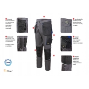 Kieszenie: dwie kieszenie w tylnej części spodni, przestrzenne kieszenie, dwie kieszenie boczne, wzmocnione kieszenie boczne, wzmocnione kieszenie zapinane na rzepy, kieszeń na komórkę, kieszeń na dokumenty, kieszeń na miarkę „metrówkę”, ergonomiczna kieszeń na nakolanniki, dwie kieszenie monterskie, dopinane na zamek;