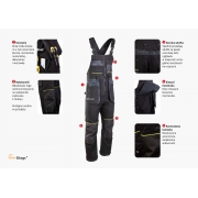 Kieszenie: dwie kieszenie w tylnej części spodni, wzmocnione kieszenie boczne, wzmocnione kieszenie zapinane na rzepy, dwie kieszonki na długopisy, kieszeń na dokumenty, kieszeń na miarkę „metrówkę”, dwie chowane kieszenie monterskie, ergonomiczna kieszeń na nakolanniki wykonana z CORDURY;