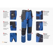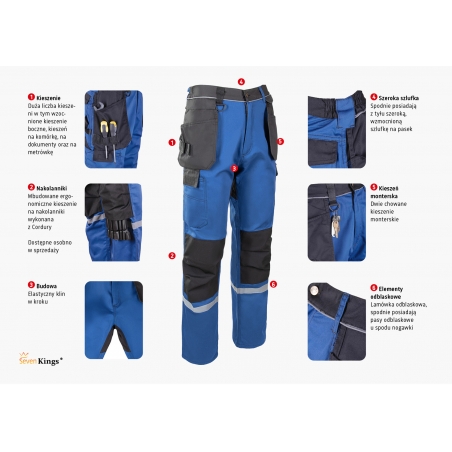 Kieszenie: dwie kieszenie w tylnej części spodni, dwie kieszenie boczne, wzmocnione kieszenie zapinane na rzepy, kieszeń na komórkę, dwie kieszonki na długopisy, kieszeń na dokumenty, kieszeń na miarkę „metrówkę”, ergonomiczna kieszeń na nakolanniki wykonana z CORDURY;