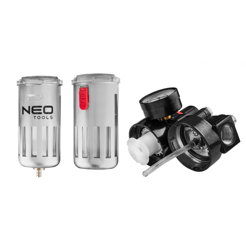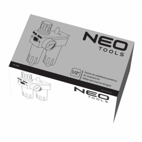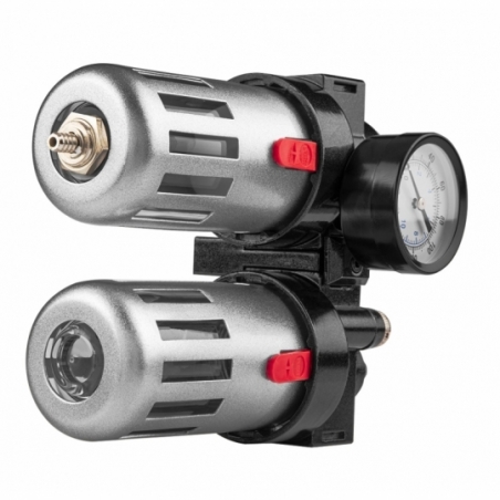 Zestaw do uzdatniania powietrza, filtr, naolejacz i reduktor, złącze 1/2", stopień filtracji > 20 µm, maksymalne ciśnienie robocze 12 barów, maksymalna przepustowość 2 500 l/min., pojemność zbiorniczka na kondensat 60 cm3, osłona metalowa, regulacja poboru oleju, półautomatyczne opróżnianie zbiorniczka, CE