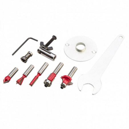 Frezarka górnowrzecionowa 1200W, uchwyt 6, 8 mm, obroty 11500–30000 min⁻¹, (LxH) 270 x 260 mm, masa 3.3 kg, akcesoria: 5 frezów, 2 tuleje zaciskowe, prowadnica równoległa, prowadnica do profili, element do cięcia po okręgu