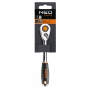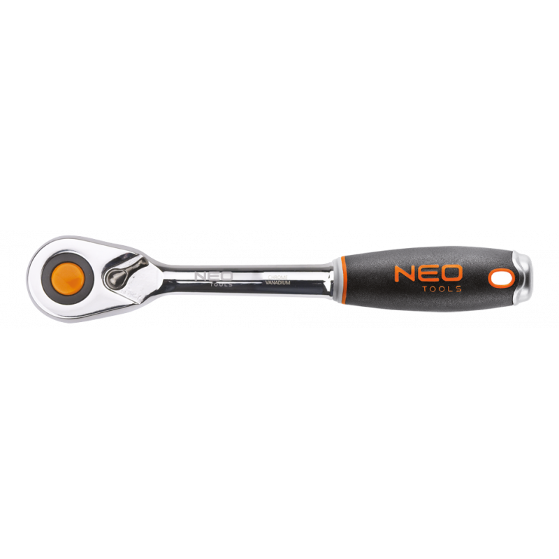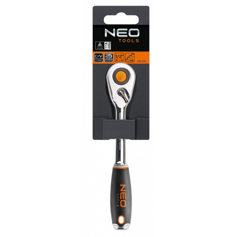 Grzechotka 1/2", 245 mm, korpus ze stali CrV, mechanizm zapadkowy ze stali CrMo, 48 zębów, przełącznik kierunku obrotów, system blokowania i zwalniania nasadki, dwumateriałowy uchwyt, DIN3122, certyfikat TÜV M+T, 25 lat gwarancji