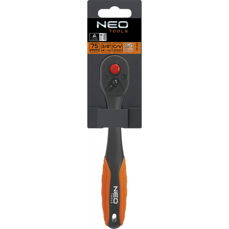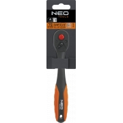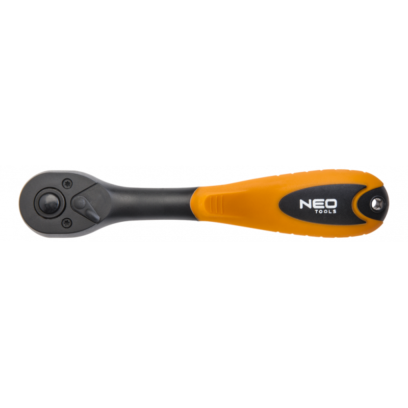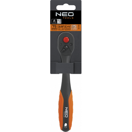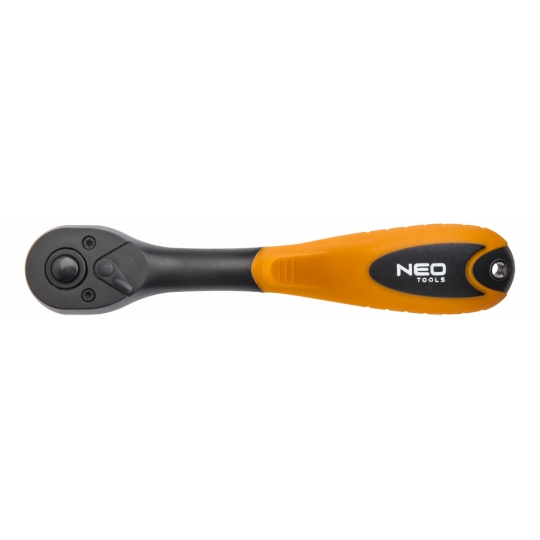 Grzechotka odgięta 3/8", 200 mm, korpus z kompozytu PP, mechanizm zapadkowy ze stali CrMo, 72 zęby, przełącznik kierunku obrotów, system blokowania i zwalniania nasadki, dwumateriałowy uchwyt, DIN3122, certyfikat TÜV M+T, 25 lat gwarancji