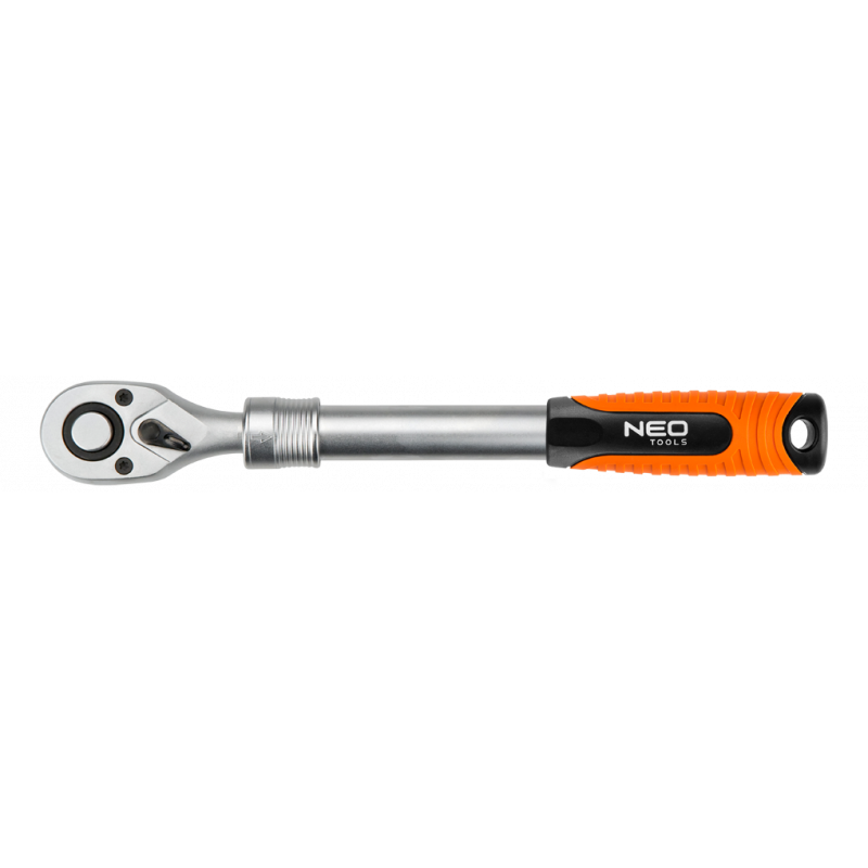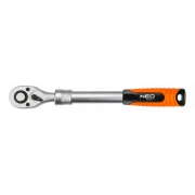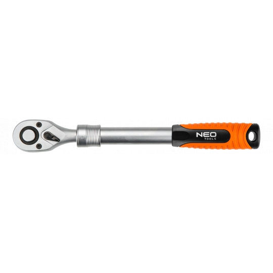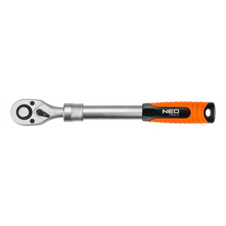 Grzechotka teleskopowa 1/4", 150-200 mm, korpus ze stali CrV, dwumateriałowy uchwyt, mechanizm zapadkowy ze stali CrMo, 72 zęby, przełącznik kierunku obrotów, system blokowania i zwalniania nasadki, dwumateriałowy uchwyt, DIN3122, certyfikat TÜV M+T, 25 lat gwarancji