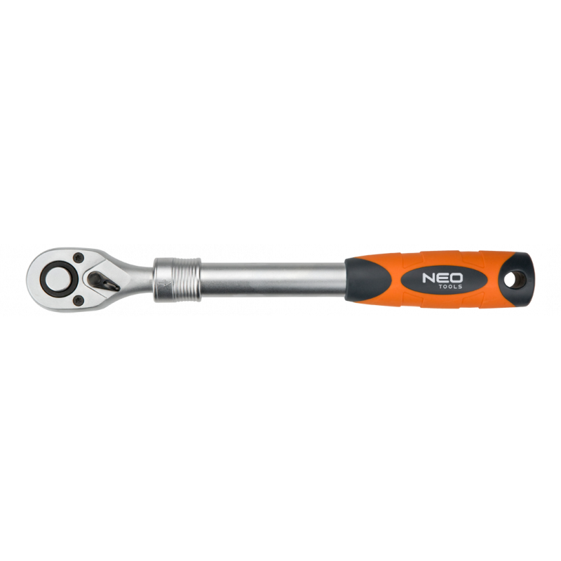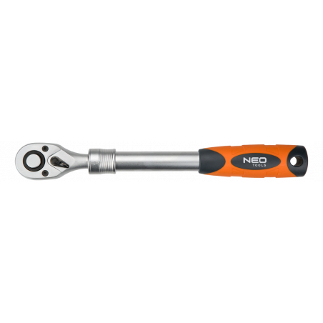 Grzechotka teleskopowa 3/8", 215-315 mm, korpus ze stali CrV, dwumateriałowy uchwyt, mechanizm zapadkowy ze stali CrMo, 72 zęby, przełącznik kierunku obrotów, system blokowania i zwalniania nasadki, dwumateriałowy uchwyt, DIN3122, certyfikat TÜV M+T, 25 lat gwarancji
