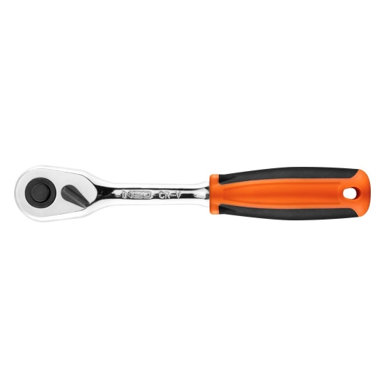 Grzechotka 1/4", 155 mm, korpus ze stali CrV, mechanizm zapadkowy ze stali CrMo, 45 zębów, przełącznik kierunku obrotów, system blokowania i zwalniania nasadki, dwumateriałowy uchwyt, DIN3122, certyfikat TÜV M+T, 25 lat gwarancji