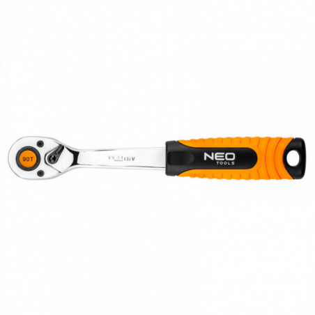 Grzechotka 1/4", 155 mm, korpus ze stali CrV, mechanizm zapadkowy ze stali CrMo, 90 zębów, przełącznik kierunku obrotów, system blokowania i zwalniania nasadki, dwumateriałowy uchwyt, DIN3122, certyfikat TÜV M+T, 25 lat gwarancji