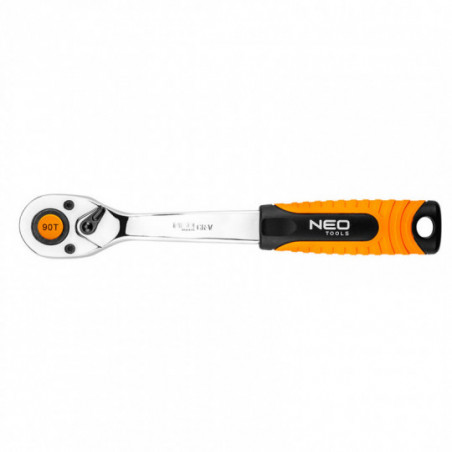 Grzechotka 1/2", 250 mm, korpus ze stali CrV, mechanizm zapadkowy ze stali CrMo, 90 zębów, przełącznik kierunku obrotów, system blokowania i zwalniania nasadki, dwumateriałowy uchwyt, DIN3122, certyfikat TÜV M+T, 25 lat gwarancji