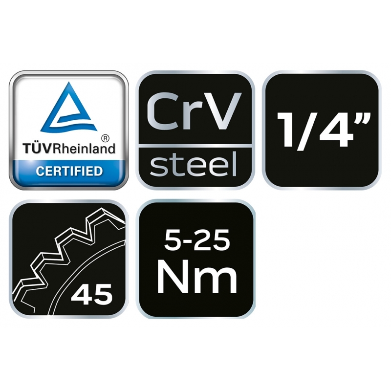 Klucz dynamometryczny 1/4", zakres 5-25NM, długość: 25 cm, metalowa konstrukcja, rura ze stali stopowej, dokładność +/-4% od 20% do 100% maksymalnego momentu obrotowego, urządzenie blokujące push-pull, klucza nie należy przechowywać ze sprężyną ustawioną na maksymalne wartości, certyfikat kalibracji, stal CrV, etui z tworzywa, certyfikat TÜV M+T
