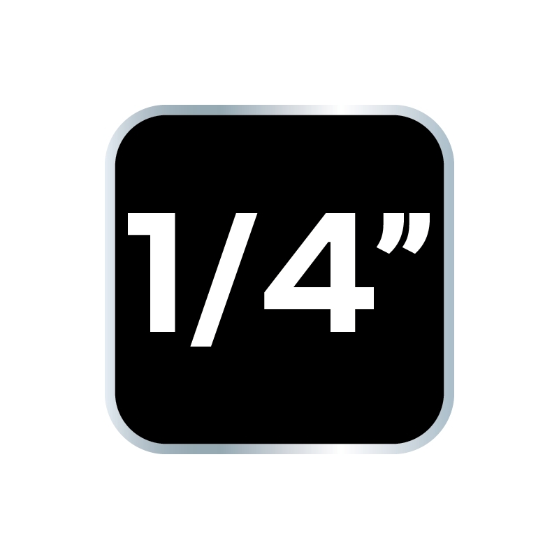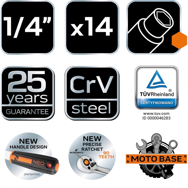 Klucze nasadowe 1/4", zestaw 14 szt., 1/4": grzechotka 135 mm, dwumateriałowy uchwyt, 90 zębów, przełącznik kierunku obrotów, przedłużka 75 mm, 12 szt. nasadek sześciokątnych, rozmiary: 4, 4.5, 5, 5.5, 6, 7, 8, 9, 10, 11, 12, 13 mm, wieszak z tworzywa, certyfikat TÜV M+T, 25 lat gwarancji