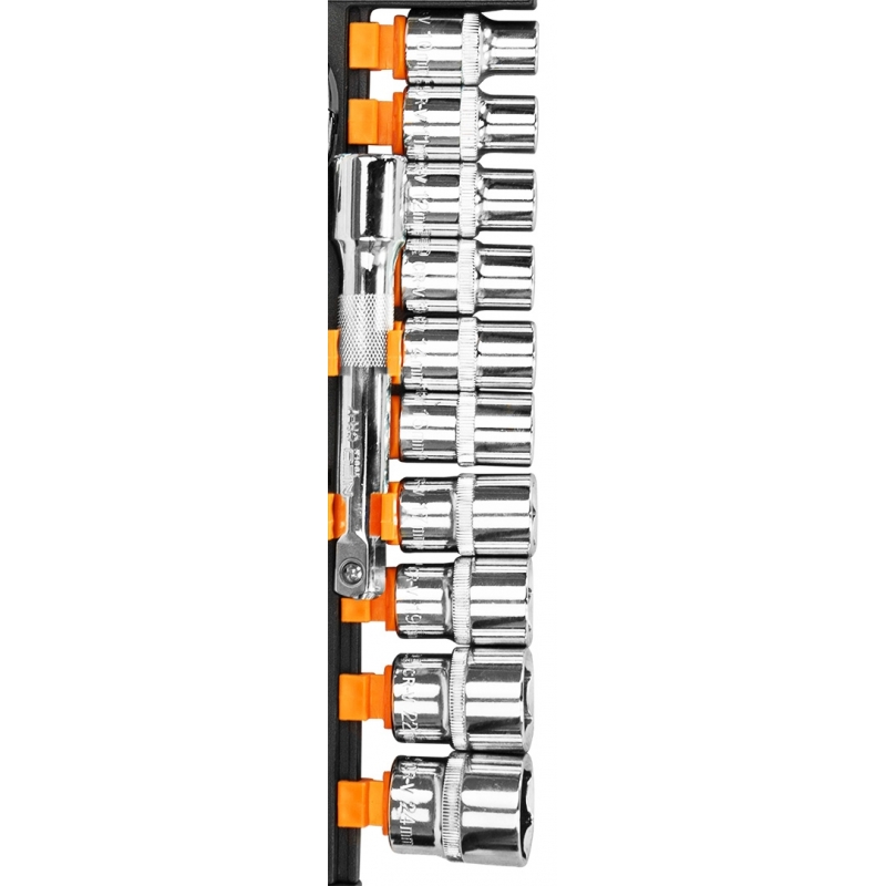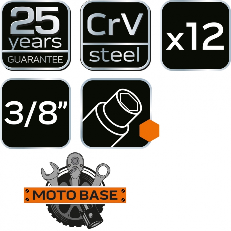 Klucze nasadowe 3/8", zestaw 12 szt. 3/8": grzechotka 160 mm, dwumateriałowy uchwyt, 90 zębów, przełącznik kierunku obrotów, przedłużka 150 mm, 12 szt. nasadek sześciokątnych, rozmiary: 8, 10, 12, 13, 14, 16, 17, 19, 21, 22 mm, wieszak z tworzywa, certyfikat TÜV M+T, 25 lat gwarancji