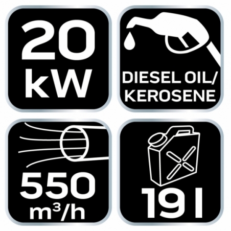 Nagrzewnica olejowa 20kW, zbiornik 19l, zużycie paliwa 1,9l/h, przepływ powietrza 550 m3/h, bez kółek