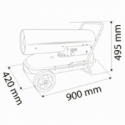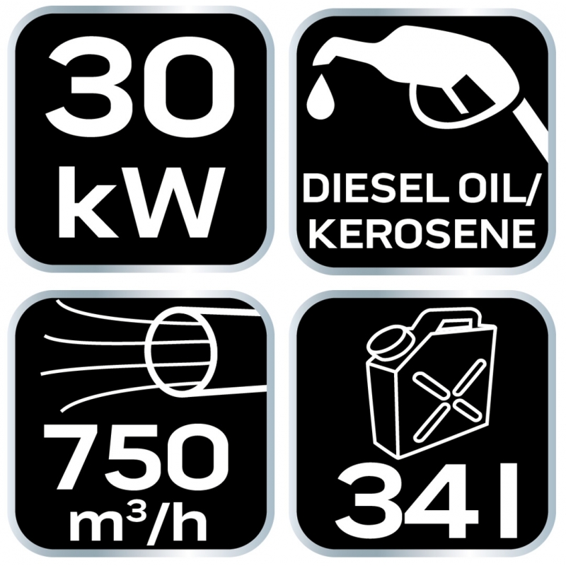 Nagrzewnica olejowa 30kW, zbiornik 34l, zużycie paliwa 2,8l/h, przepływ powietrza 750 m3/h, kółka
