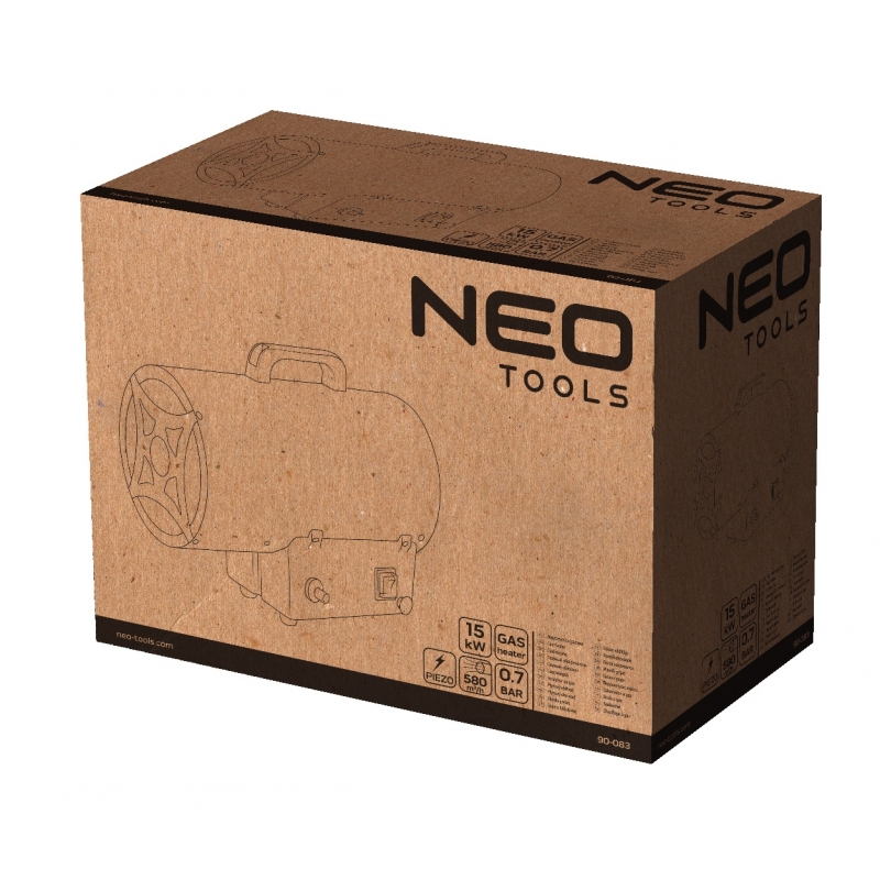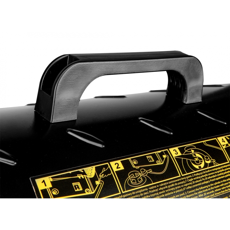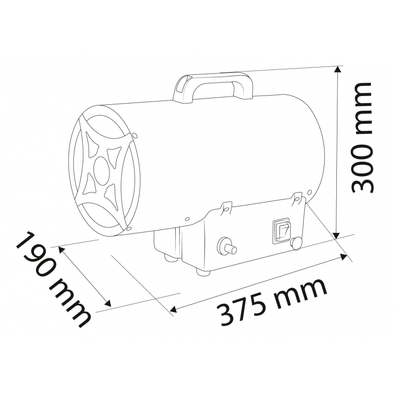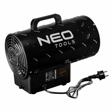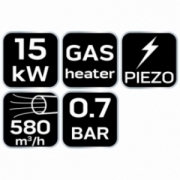 Nagrzewnica gazowa 15kW, ciśnienie 0,7 bar, zużycie paliwa 1,09 kg/h, przepływ powietrza 580 m3/h, reduktor ciśnienia, wąż 1,5m, zapłon piezo