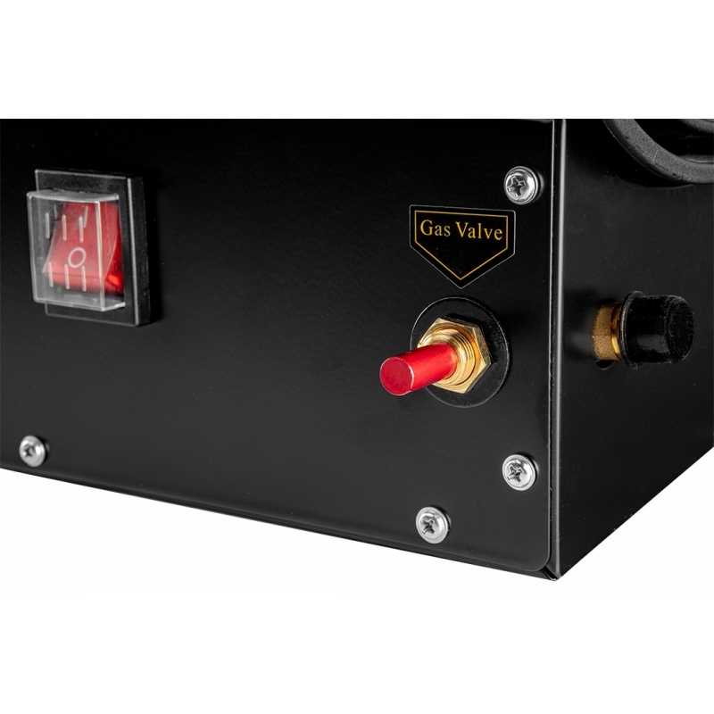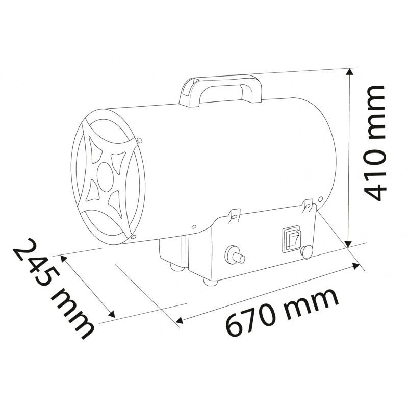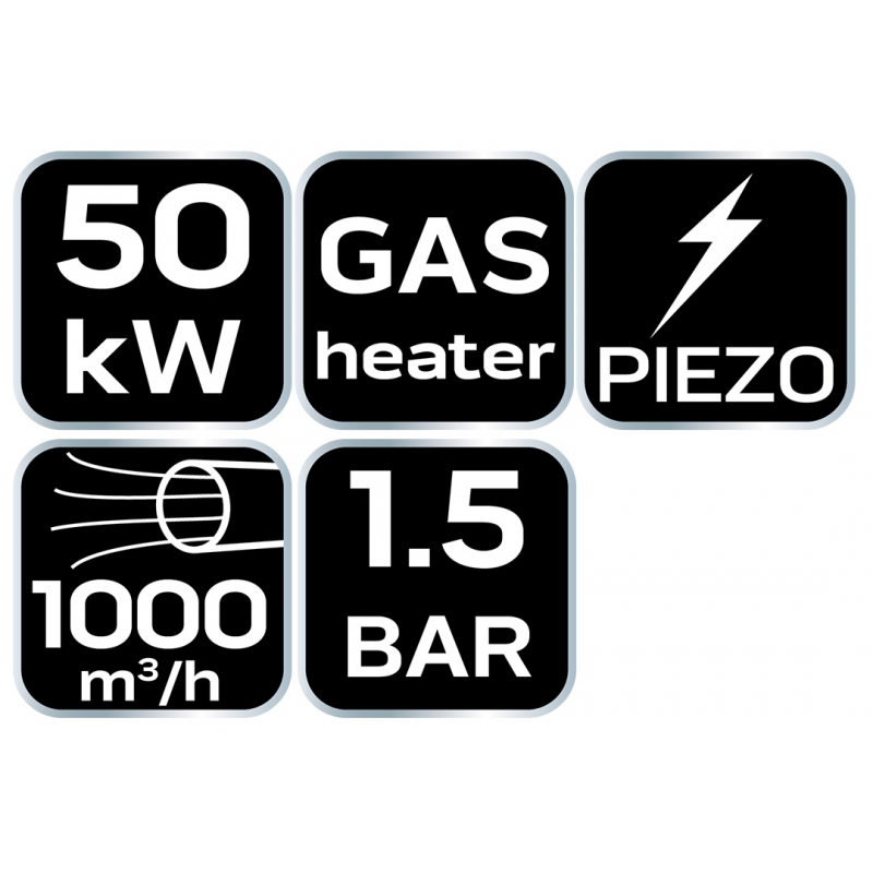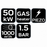 Nagrzewnica gazowa 50kW, ciśnienie 1,5 bar, zużycie paliwa 3,63 kg/h, przepływ powietrza 1000 m3/h, reduktor ciśnienia, wąż 1,5m, zapłon piezo