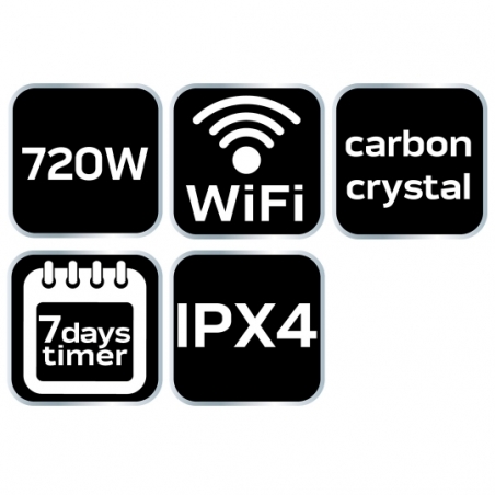 Panel grzewczy na podczerwień 720W, wyświetlacz LED, sterowanie ekranem dotykowym na panelu, ustawienie temperatury w zakresie 16-37 st, ustawienie czasu do 9 h, sterowanie przez Wifi, sterowanie przez aplikację Wifi w zakresie tygodniowym, dwa termostaty chroniące przed przegrzaniem, w zestawie akcesoria do montażu naściennego, możliwość montażu na suficie (konieczność zakupu dodatkowych akcesoriów do montażu) lub ustawienia wolnostojącego (konieczność zakupu nóg). Wymiary panelu: 60*120*3.8 cm