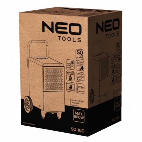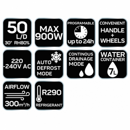 Osuszacz budowlany AC220-240V, 50Hz, moc 750W (27°C RH60%), moc maksymalna 900W (30°C RH80%), odprowadzanie wilgoci 50L/D (30℃ RH80%) 30L/D(27℃ RH60%); przepływ powietrza:300 m³/h; zbiornik na wodę 7l; czynnik chłodzący R290; programowanie do 24h; funkcja automatycznego rozmrażania, opcja ciągłego drenażu; wymiary produktu: szer. 48 cm x gł. 45 cm x wys. 65,5 cm, waga 30kg, uchwyt i kółka.