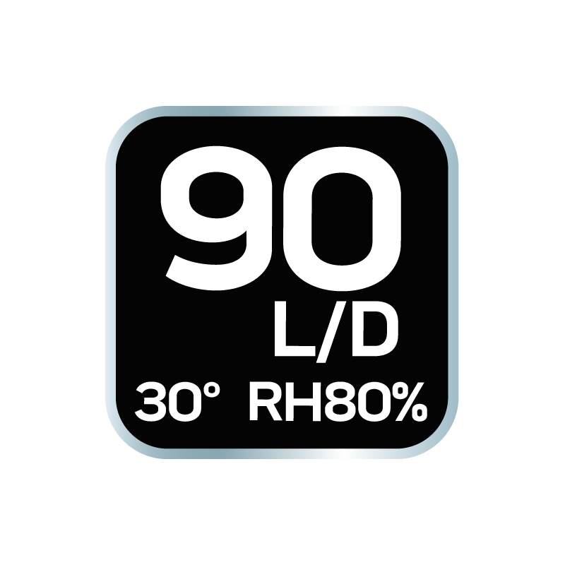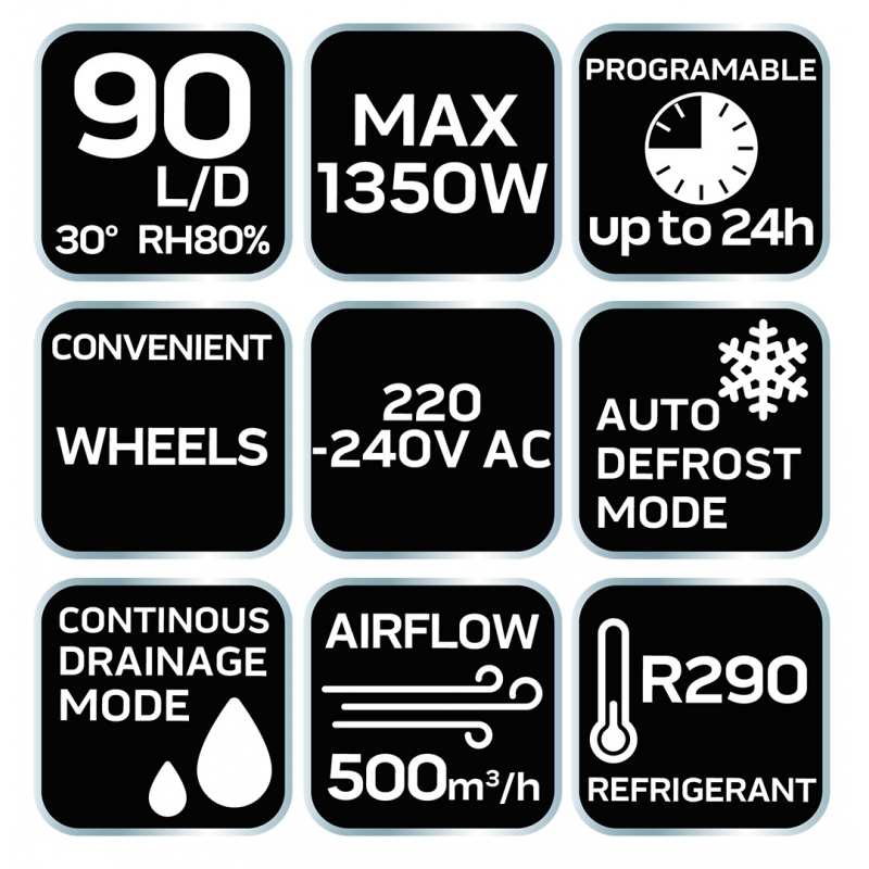 Osuszacz budowlany AC220-240V, 50Hz, moc 1000W (27°C RH60%), moc maksymalna 1350W (30°C RH80%), odprowadzanie wilgoci 90L/D (30℃ RH80%) 50L/D(27℃ RH60%); przepływ powietrza: 500 m³/h; czynnik chłodzący R290; programowanie do 24h; funkcja automatycznego rozmrażania, ciągły drenaż; wymiary produktu: szer. 48 cm x gł. 40,5 cm x wys. 91 cm, waga 48kg.