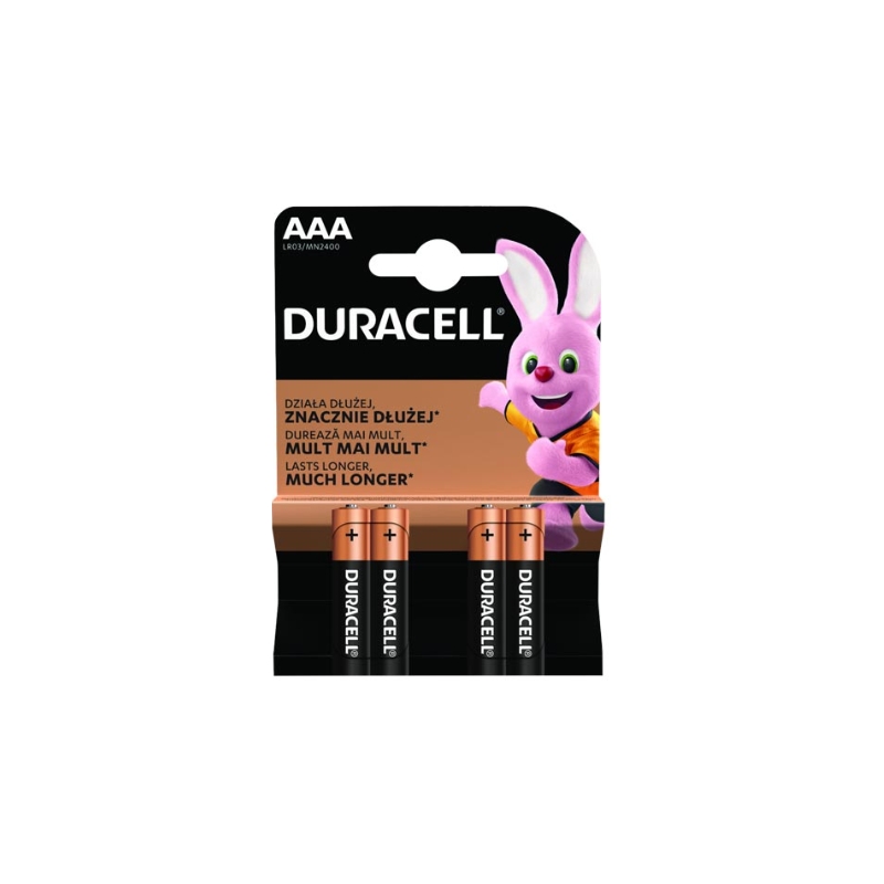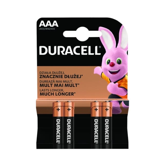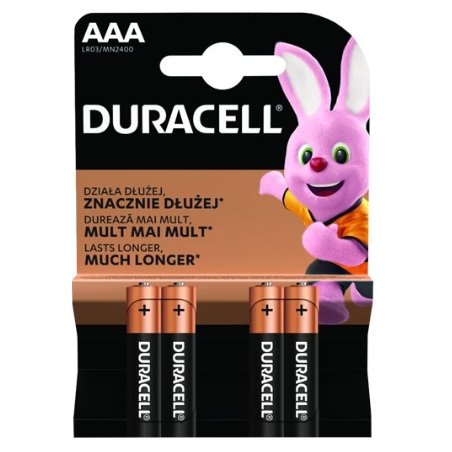 Baterie DURACELL LR-03/AAA. - baterie alkaliczna przeznaczone do codzienne użytku zarówno do urządzeń o wysokim jak i średnim poborze mocy - wykonane z alkalicznego ditlenku manganu, który wystarcza na dużo dłuższy czas niż konwencjonalne baterie cynkowo-węglowe, dzięki czemu doskonale nadają się do przechowywania przez długi czas - gwarantują niezawodność i długi okres eksploatacji.