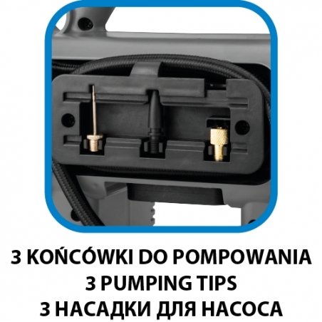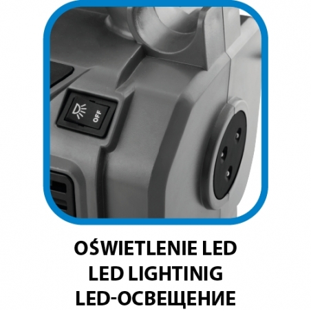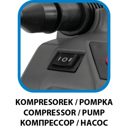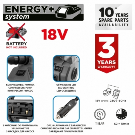 Kompresor akumulatorowy Energy+ 18V bez akumulatora. Dane techniczne: napięcie zasilania (akumulator Energy+) 18V DC, napięcie zasilania (zapalniczka samochodowa) 12V DC, kompresor i pompka, funkcja deflacji, moc znamionowa 60 W, ciśnienie robocze 11 bar, S2: 10 min, waga 1,6 kg.