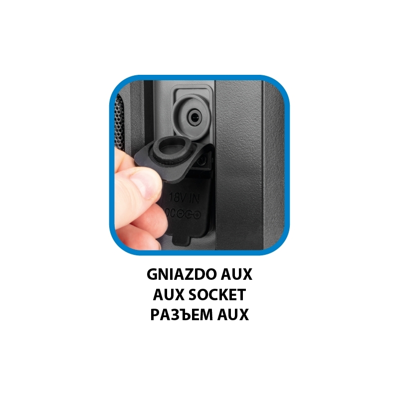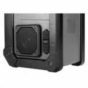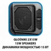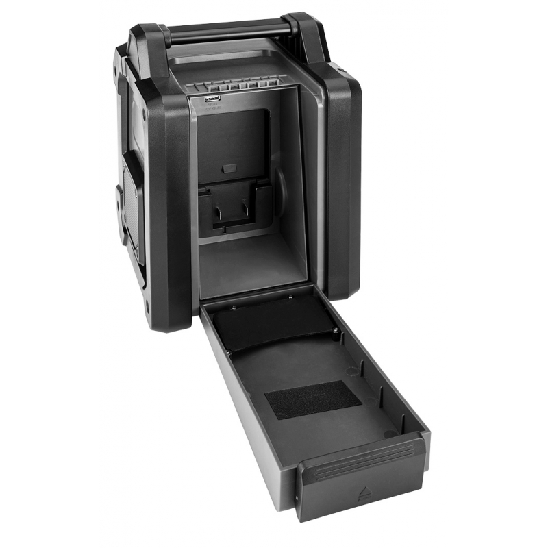 Radio budowlane akumulatorowo-sieciowe 18 V, 2 głośniki 15 W oraz gniazda USB i AUX. F. Radio obsługuje 30 stacji Fm (87,5 – 108 mHZ), 30 stacji DAB (174 – 240 mHz) oraz Bluetooth 5.0, częstotliwość bluetooth 2,4 GHz, zasięg sygnału bluetooth 10m, impedancja znamionowa 4Ω, stosunek sygnału do szumu 60 dB. Funkcje sleep function, alarm oraz zegar z automatyczną regulacją. Kolorowy wyświetlacz 2,4 cala z opcją rozjaśniania i przyciemniania. Uchwyt na telefon. Waga 2,75 kg.