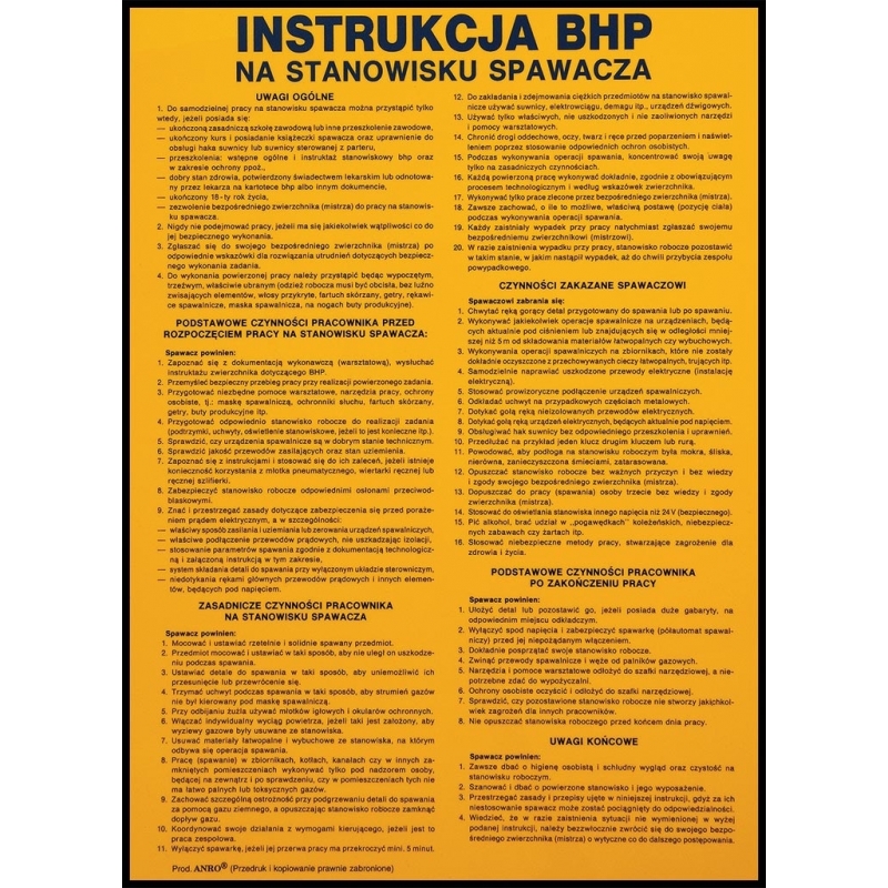 Instrukcje BHP „Instrukcja BHP na stanowisku spawacza”. - znak w rozmiarze 250x350 - wykonany z płyty PCV
