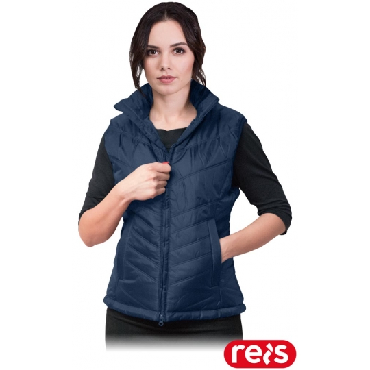 RAW-POL OREGON to damski pikowany bezrękawnik ochronny ocieplany wykonany z lekkiej tkaniny poliestrowej, z poliestrową wyściółką oraz podszewką z tafty. Wyposażony w dwie boczne kieszenie na suwak oraz dwustronny zamek błyskawiczny. Fason SLIM.