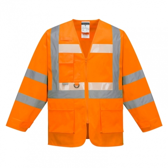 - Kamizelka z długimi rękawami wykorzystuję naszą innowacyjną technologię Glowtex. Połącznie fluorescencyjnej tkaniny taśmy odblaskowej HiVisTex i fosforyzującej tśmy Glowtex która sama z siebie świeci w ciemności. Posiada podwójną kieszeń na identyfikator i wiele kieszeni.