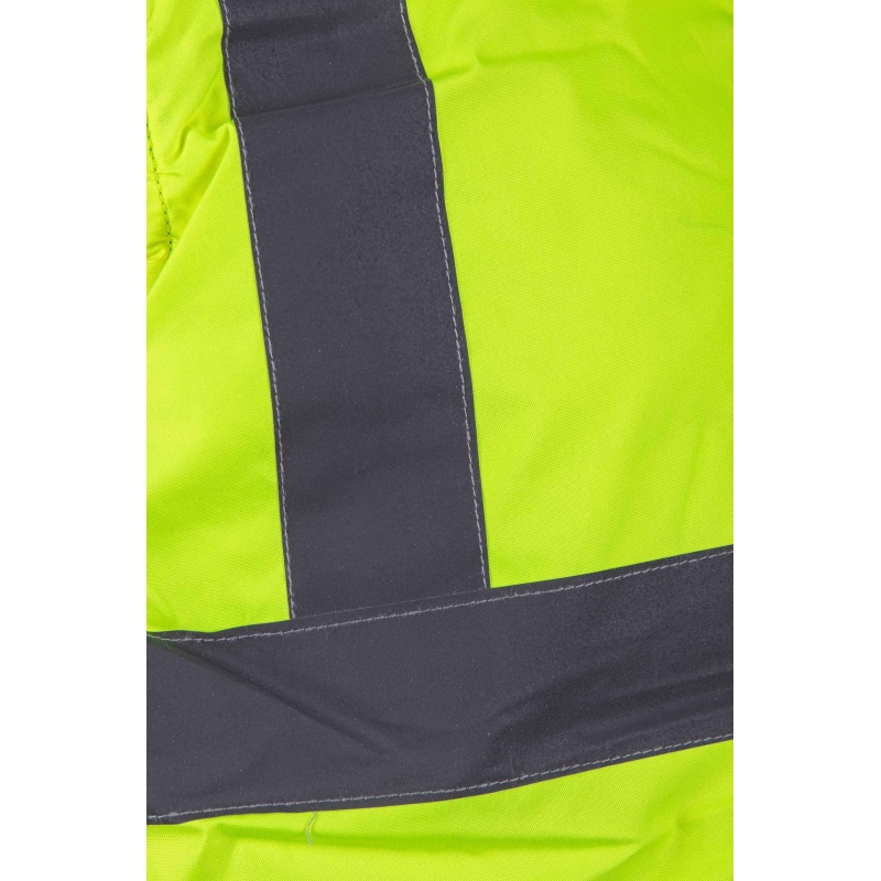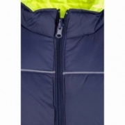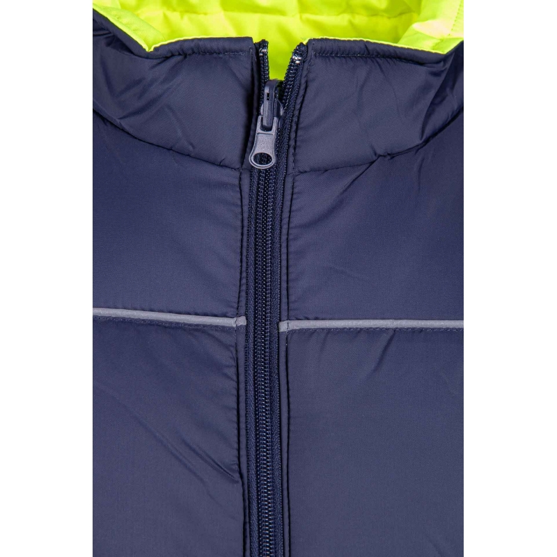 .Kieszenie: na stronie granatowej dwie kieszenie boczne, zakończone patką z lamówką, na stronie jaskrawej dwie kieszenie zapinane na zamek, zakryte listwą,