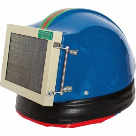 Hełm powietrzny typu GRANIT. - hełm przeznaczony do stosowania w obróbce strumieniowo–ściernej - część składowa aparatu wężowego sprężonego powietrza - hełm wykonany jest w kształcie kasku skorupowego z zabudowanym w części twarzowej wizjerem - ramkę wizjera prostokątna, płaska montowana na zawiasach - wizjer posiada dwie płaskie szyby: od strony twarzy z poliwęglanu, posiadającego bardzo dużą odporności na uderzenia, drugą ze szkła zwykłego podklejonego folią antyodpryskową - wizjer od strony zewnętrznej dodatkowo zabezpiecza siatka metalowa - szyby, ramka, siatka, nakrętki mocujące ramkę, uszczelki oraz fartuch są wymienne - stosować w temperaturze od -10C do +35C - hełm przeznaczony jest do ochrony układu oddechowego i twarzy pracownika zatrudnionego przy czyszczeniu konstrukcji stalowych, betonu, odlewów lub innych elementów metodą strumieniowo-ścierną - przeznaczony do ochrony osób na stanowiskach do obróbki strumieniowo ściernej, tzw piaskowanie