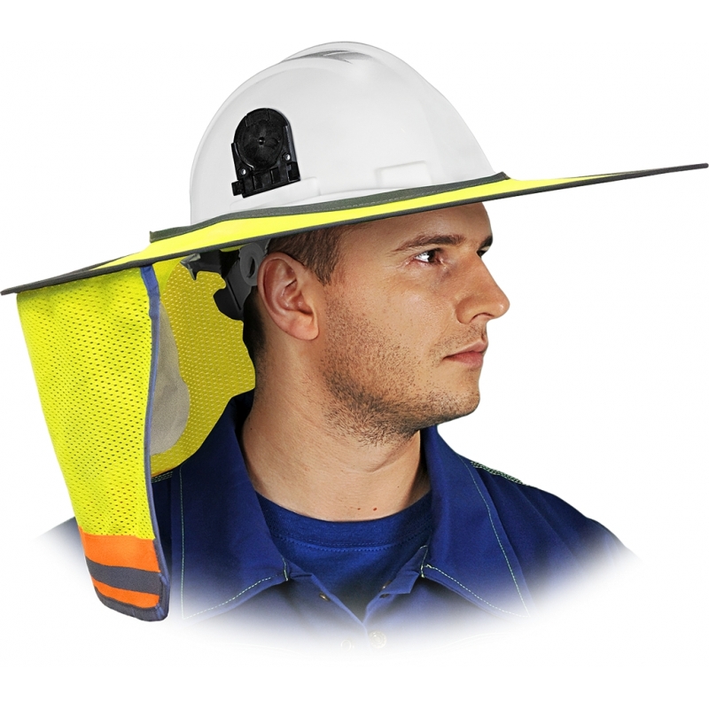 - zakrywa kark, chroniąc przed słońcem, opiłkami, kurzem czy odpryskami spadającymi z góry