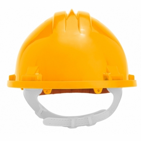 Kask ochronny atestowany, żółty, regulowany obwód 54-61cm, materiał: HDPE, klasa 0, uprząż 6-punktowa, waga: 322g, chroni przed uderzeniami przedmiotów takich jak kamienie, dachówka, cegły i inne podobne przedmioty, chroni od wyładowań elektrycznych od 1000V AC oraz 1500V DC (instalacje niskonapięciowe), w zestawie opaska przeciw potowa, certyfikat CE