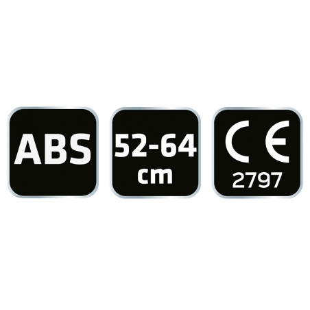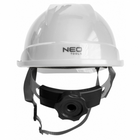 Hełm przemysłowy z paskiem podbródkowym, biały, regulowany obwód 52-64cm, materiał: ABS, uprząż 6-punktowa, 4-punktowy pasek podbródkowy, chroni przed uderzeniami przedmiotów takich jak kamienie, dachówka, cegły i inne podobne przedmioty, może być używany w zakresie temperatur -30°C/+50°C, automatyczna regulacja obwodu za pomocą pokrętła, posiada otwory wentylacyjne, w zestawie opaska przeciw potowa, certyfikat CE