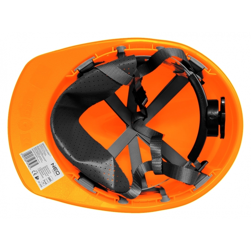 Hełm przemysłowy z paskiem podbródkowym, pomarańczowy, regulowany obwód 52-64cm, materiał: ABS, uprząż 6-punktowa, 4-punktowy pasek podbródkowy, chroni przed uderzeniami przedmiotów takich jak kamienie, dachówka, cegły i inne podobne przedmioty, może być używany w zakresie temperatur -30°C/+50°C, automatyczna regulacja obwodu za pomocą pokrętła, posiada otwory wentylacyjne, w zestawie opaska przeciw potowa, certyfikat CE