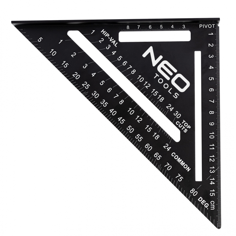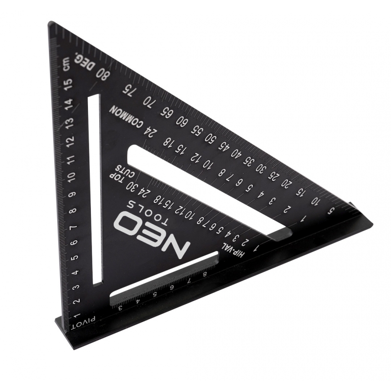 Kątownik 15 cm, wykonany z aluminium, wymiary 18,3x18,3x2,2 cm, do szybkiego wyznaczania kątów 45 i 90°, podziałka w cm i calach, specjalistyczne podziałki kątowe przeznaczone do pomiarów wykonywanych przy pracach dekarskich i ciesielskich