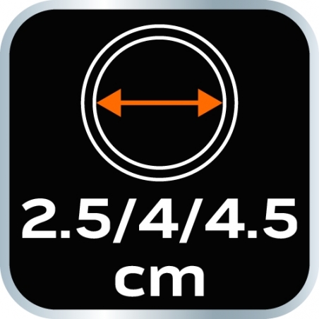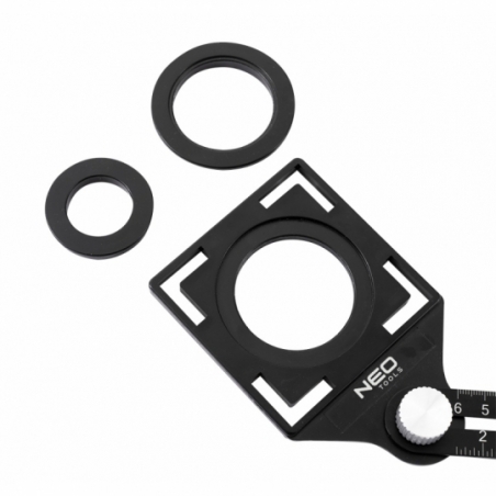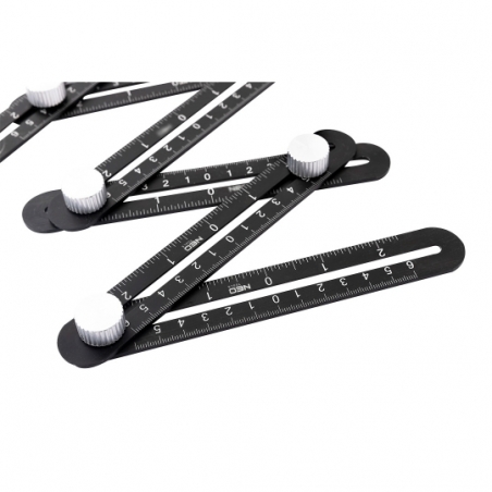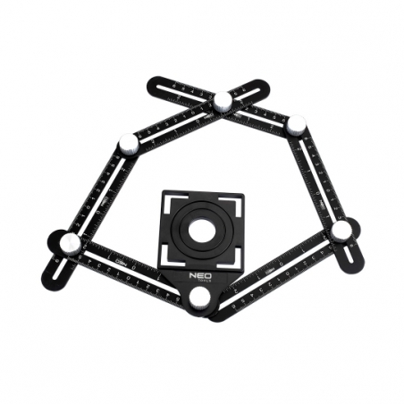 Linijka kątowa, 6 ramiona, ramion wykonane z aluminium, szablon otworów wykonany z tworzywa sztucznego (ABS), sześć ramion o długości skali od 0 do 6 cm w obu kierunkach (0-2 cale), wymiary otworów: 2,5 cm, 4 cm, 4,5 cm, podziałka w cm i inch, odporny na upadki, trwały, zastosowanie: odwzorowywanie i przenoszenie kształtów przy pracy z: cegłami, drewnem, glazurą, terakotą, metalem itd.