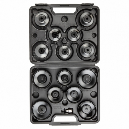 Klucze nasadowe do filtrów oleju: redukcja 3/8" - 1/2", nasadki: 14 kątna : 65 | 67 | 68 | 76 mm; 15 kątna : 74 | 75 | 77 | 80 | 82 | 90 | 93 | 100 mm; 30 kątna : 76mm; 36 kątna : 93mm