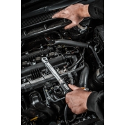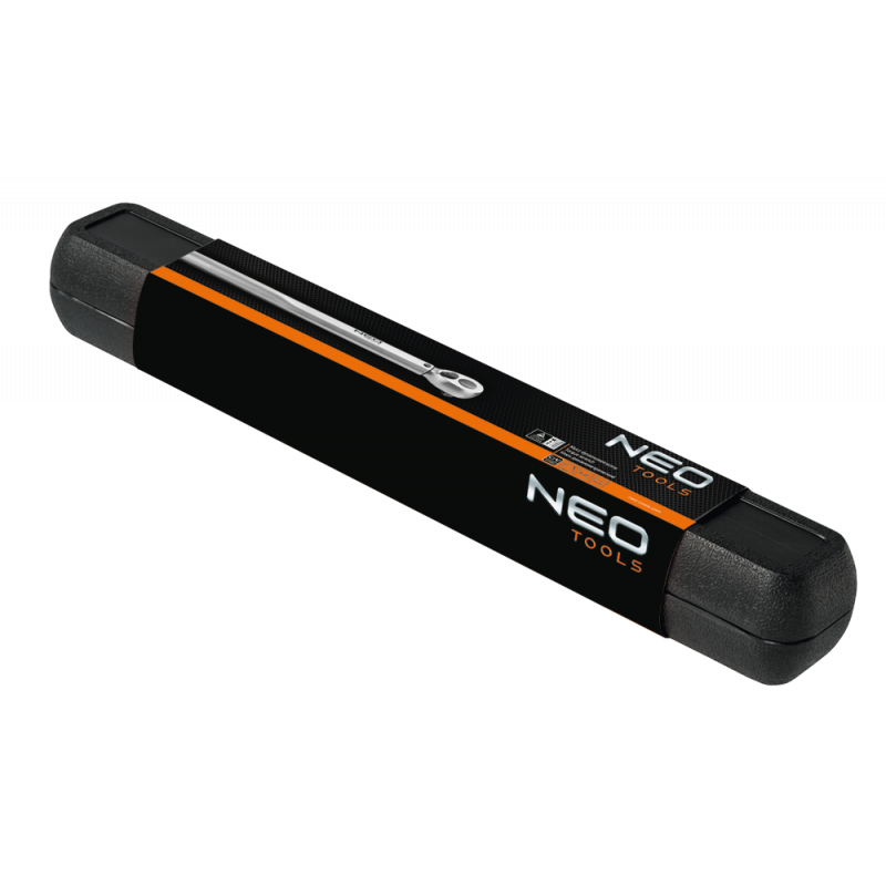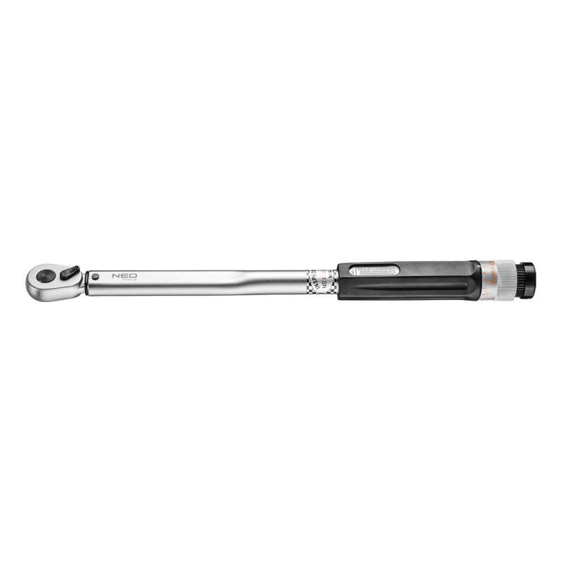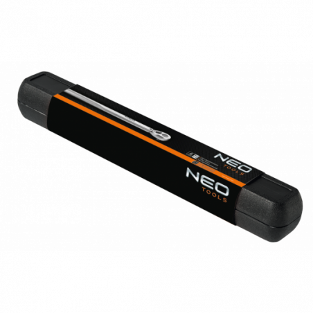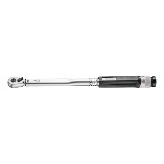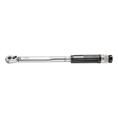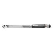 Klucz dynamometryczny 3/8" x 420 mm, 20-100 Nm, posiada mechanizm zapadkowy z 24 zębami, pierścień blokujący, okienko ze skalą, klucza nie należy przechowywać ze sprężyną ustawioną na maksymalne wartości, stal CrV, etui z tworzywa, certyfikat TÜV M+T