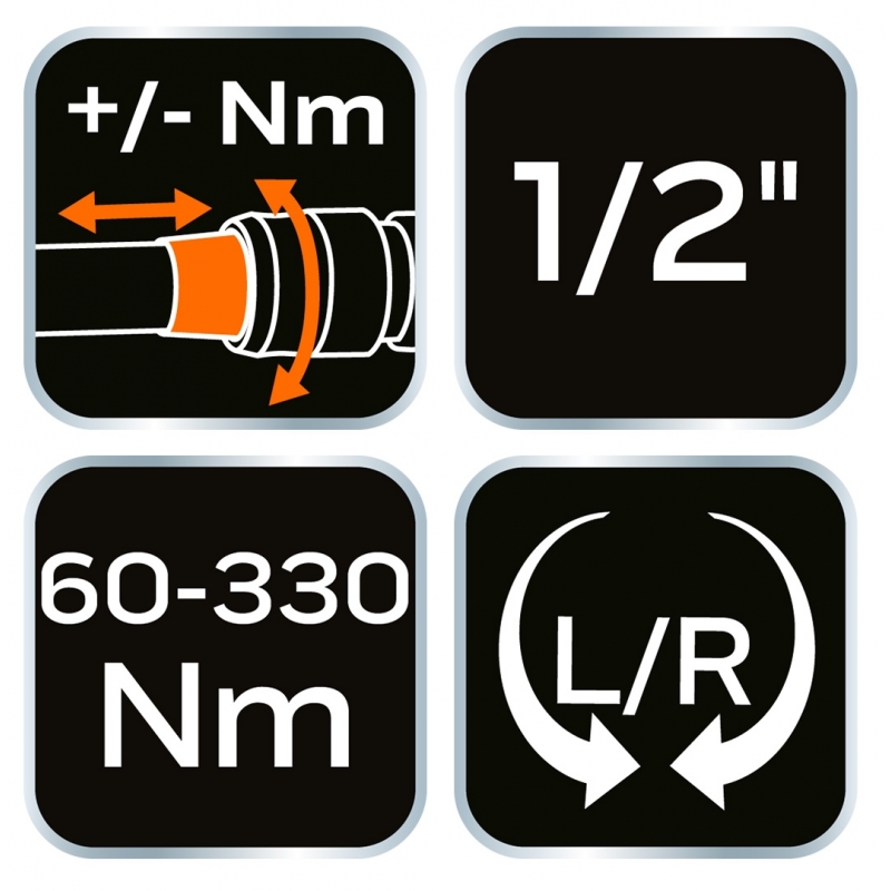Klucz dynamometryczny dwukierunkowy 1/2" 60-330Nm, długość klucza 570 mm, automatyczna blokada nastawień, mechanizm zapadkowy 72 zęby, pierścień blokujący, dokładność +/- 3% dla prawych gwintów i +/- 6% dla lewych gwintów, klucza nie należy przechowywać ze sprężyną ustawioną na maksymalne wartości, certyfikat kalibracji, stal CrV, opakowanie walizka