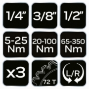 Zestaw kluczy dynamometrycznych dwukierunkowych 3 szt. zakres: 1/4" 5-25 Nm; 3/8" 20-120 Nm; 1/2" 60-330 Nm; dokładność +/- 3% w prawo i +/- 6% w lewo; 72 zęby stal CRV; opakowanie aluminiowa walizka