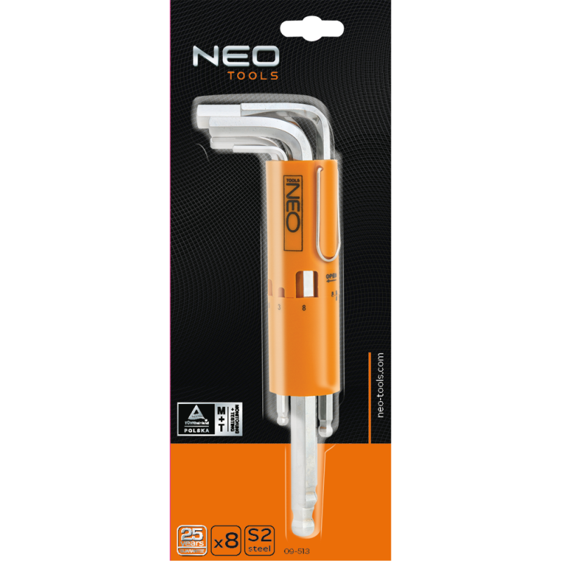 Klucze sześciokątne 2.5-10 mm, zestaw 8 szt., końcówki kuliste o kącie roboczym 30°, stal S2, ISO2936, rozmiary: 2, 2.5, 3, 4, 5, 6, 8, 10 mm, certyfikat TÜV M+T, 25 lat gwarancji