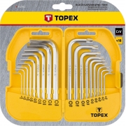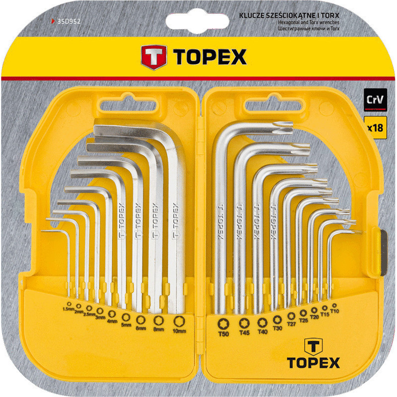 Klucze sześciokątne i Torx, zestaw 18 szt., krótkie, stal CrV, rozmiary sześciokątne: 1.5, 2, 2.5, 3, 4, 5, 6, 8, 10 mm, Torx: T10, T15, T20, T25, T27, T30, T40, T45, T50, etui z tworzywa