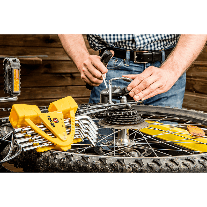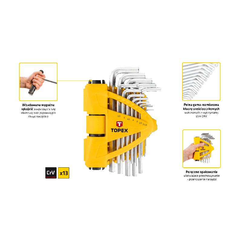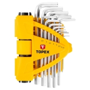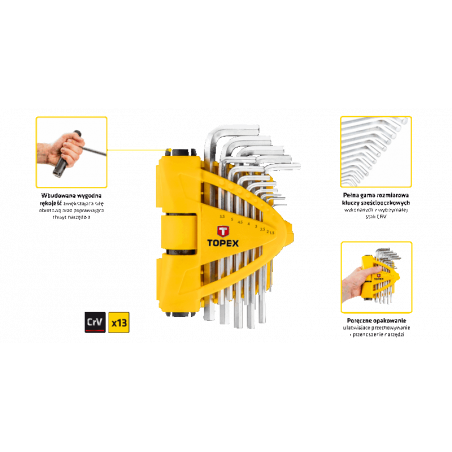 Klucze sześciokątne TOPEX, zestaw 13 szt., z uchwytem, stal CrV, rozmiary: 1.5, 2.0, 2.5, 3.0, 4.0, 4.5, 5.0, 5.5, 6.0, 7.0, 8.0, 9.0, 10 mm.