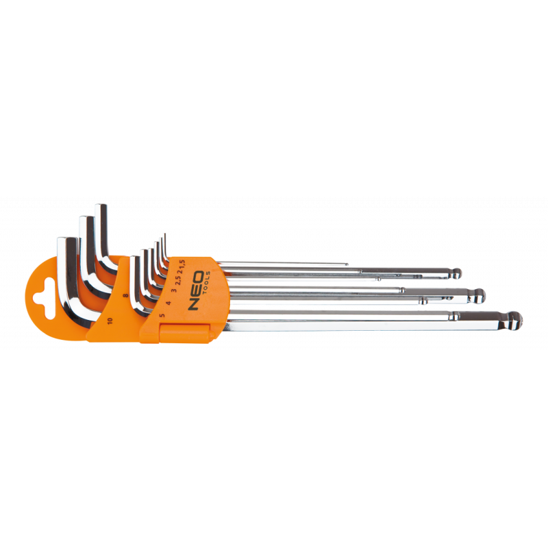 Klucze sześciokątne 1.5-10 mm, zestaw 9 szt., z końcówką kulistą i magnetyczną, końcówki kuliste o kącie roboczym 30°, stal S2, DIN911, ISO2936, rozmiary: 1.5, 2, 2.5, 3, 4, 5, 6, 8, 10 mm, certyfikat TÜV M+T, 25 lat gwarancji