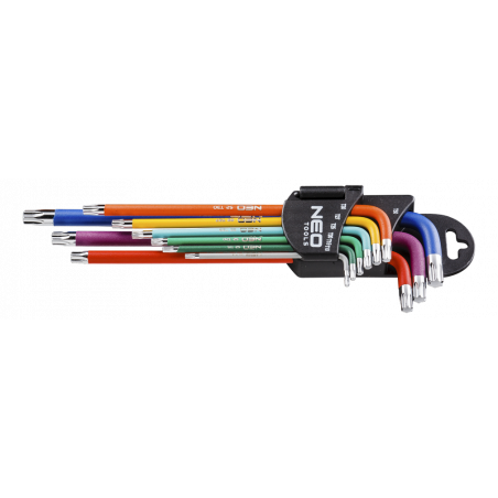 Klucze Torx T10-T50, zestaw 9 szt., stal SNCM+V, kolorowy kod ułatwiający wybór rozmiaru, rozmiary: T10, T15, T20, T25, T27, T30, T40, T45, T50, certyfikat TÜV M+T, gwarancja 25 lat